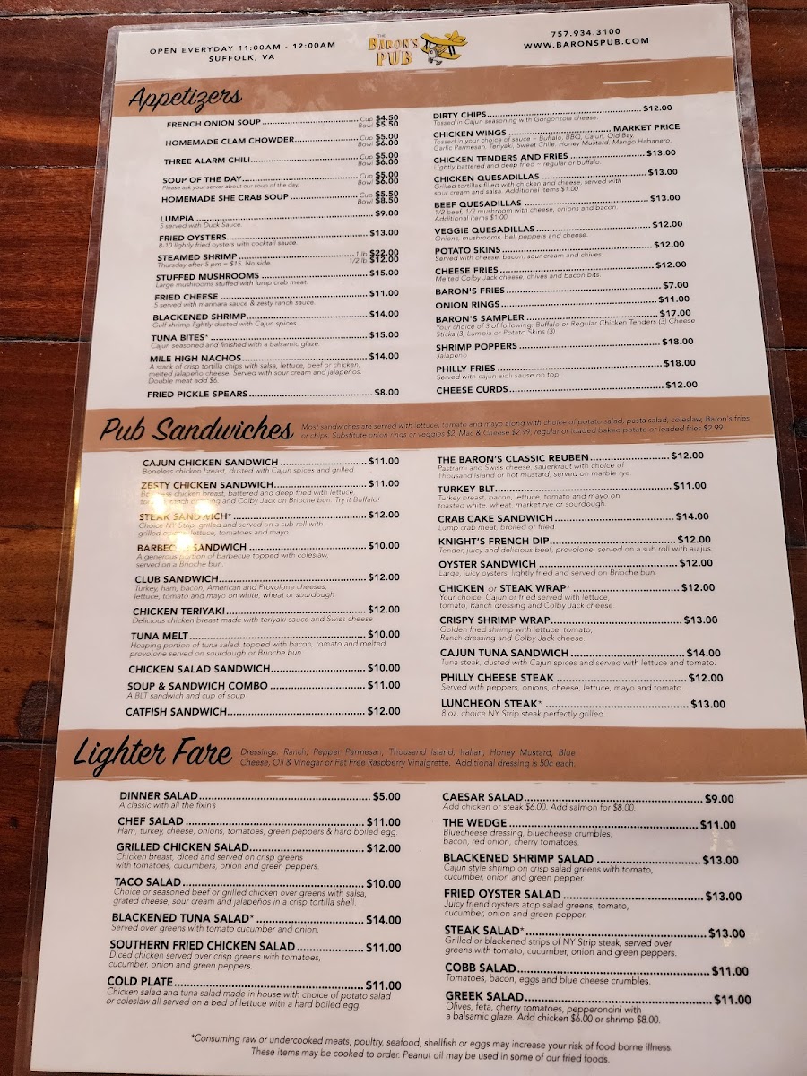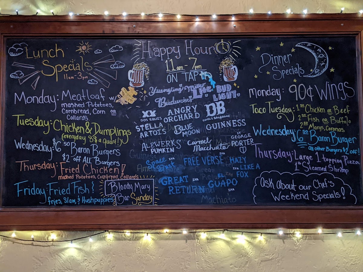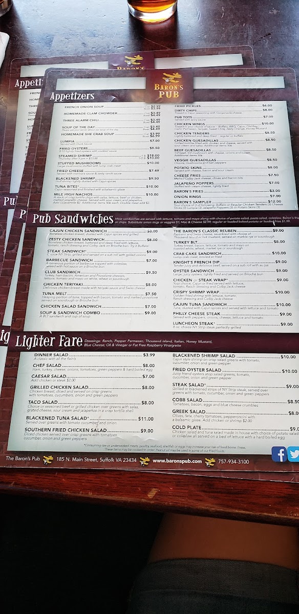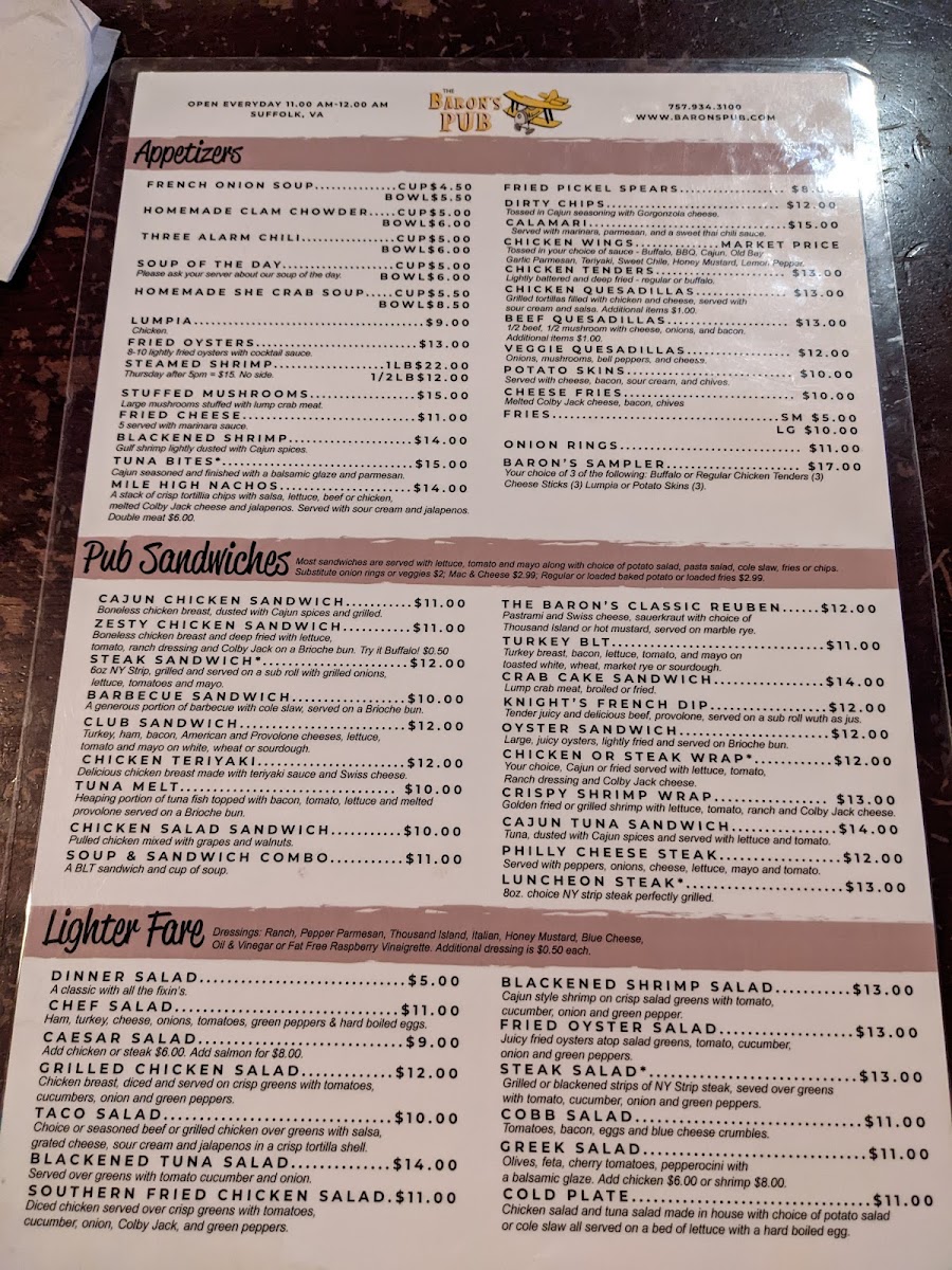 When you step into Baron's Pub, located at 185 N Main St, Suffolk, VA, you're in for a treat that blends comfort and flavor effortlessly. The menu here is a delightful mix of classic pub fare and hearty favorites, designed to satisfy every craving. Whether you're in the mood for a juicy burger, crispy wings, or a fresh salad, there's something to hit the spot. For those who prefer a bit of variety, you'll find plenty of shareable plates and specials to enjoy with friends over a cold drink. Every dish is crafted with care, ensuring that each bite delivers bold flavors and satisfying textures. From light bites to filling meals, Baron's Pub Menu offers a little bit of everything, making it the perfect place to unwind and indulge.