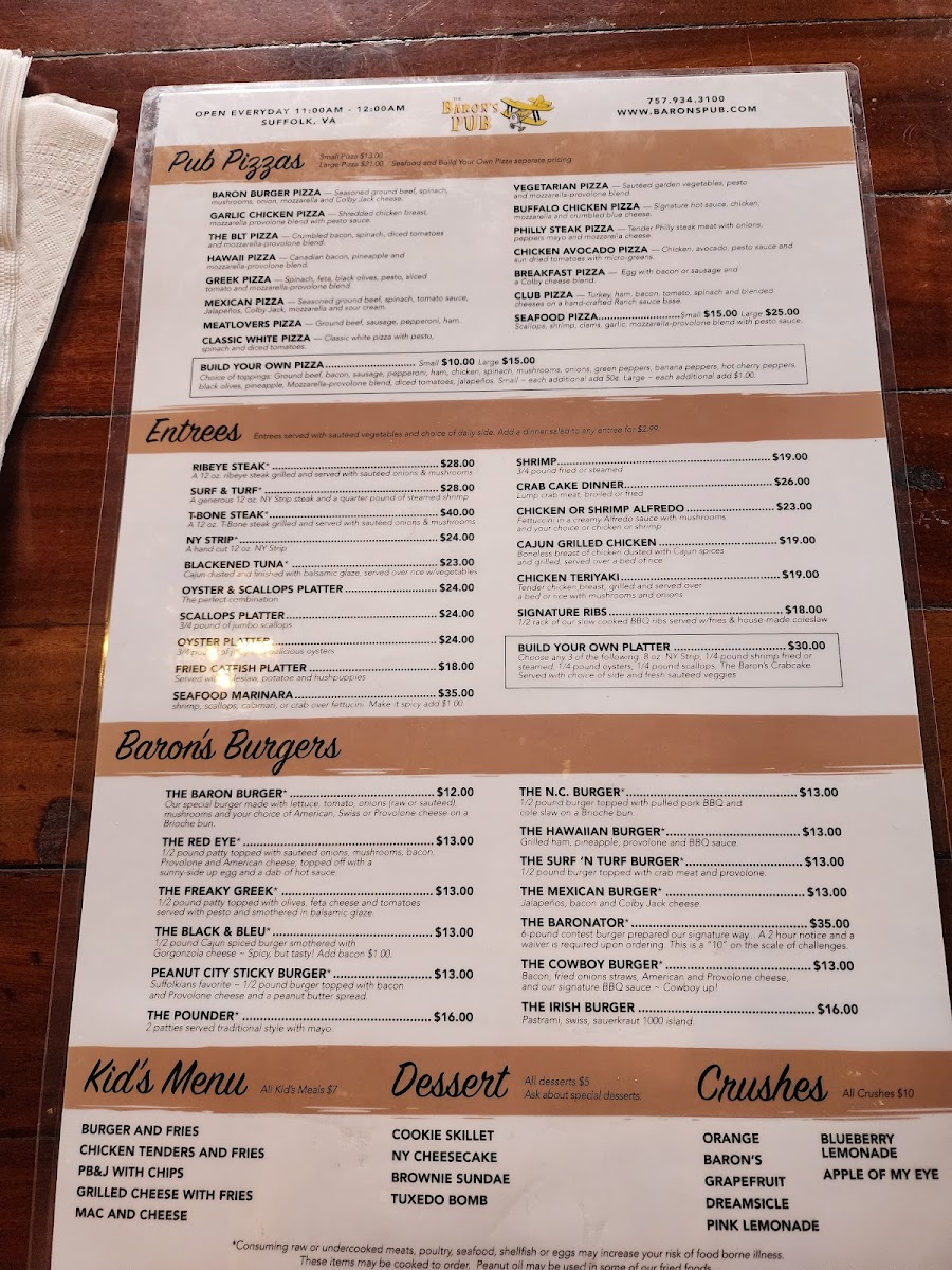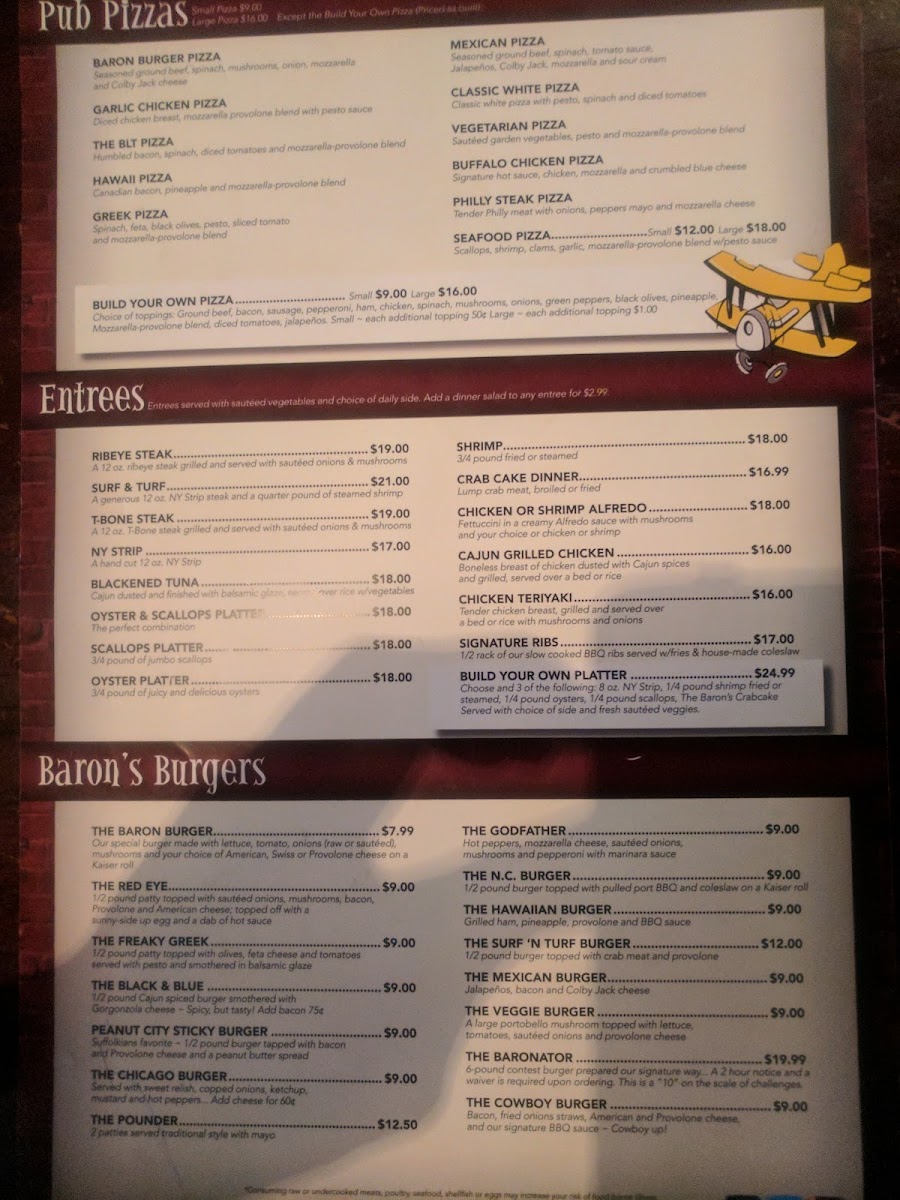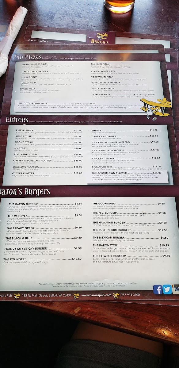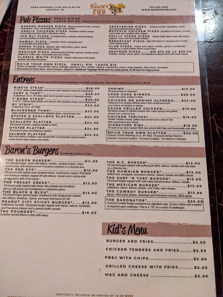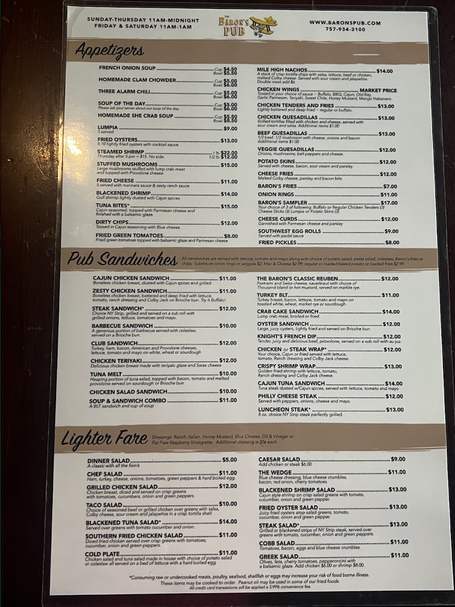 When you step into Baron's Pub, located at 185 N Main St, Suffolk, VA, you're in for a treat that blends comfort and flavor effortlessly. The menu here is a delightful mix of classic pub fare and hearty favorites, designed to satisfy every craving. Whether you're in the mood for a juicy burger, crispy wings, or a fresh salad, there's something to hit the spot. For those who prefer a bit of variety, you'll find plenty of shareable plates and specials to enjoy with friends over a cold drink. Every dish is crafted with care, ensuring that each bite delivers bold flavors and satisfying textures. From light bites to filling meals, Baron's Pub Menu offers a little bit of everything, making it the perfect place to unwind and indulge.